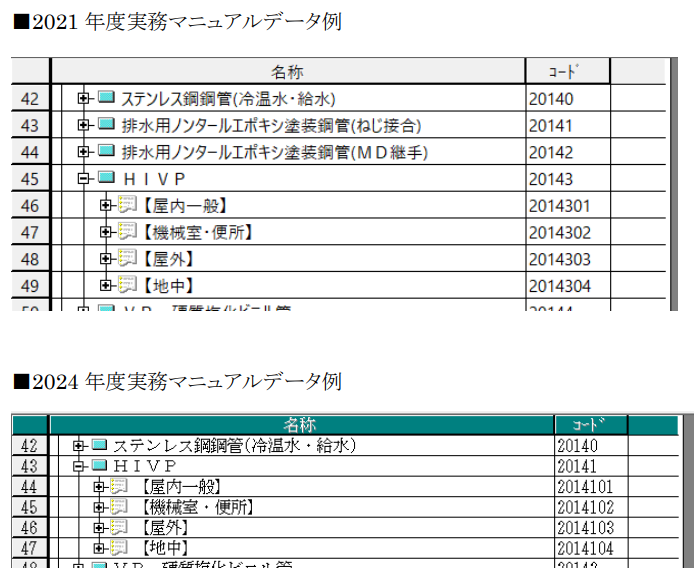2021 年データにあった「排水用ノンタールエボキシ塗装鋼管」が無くなりコードが変更となっています。